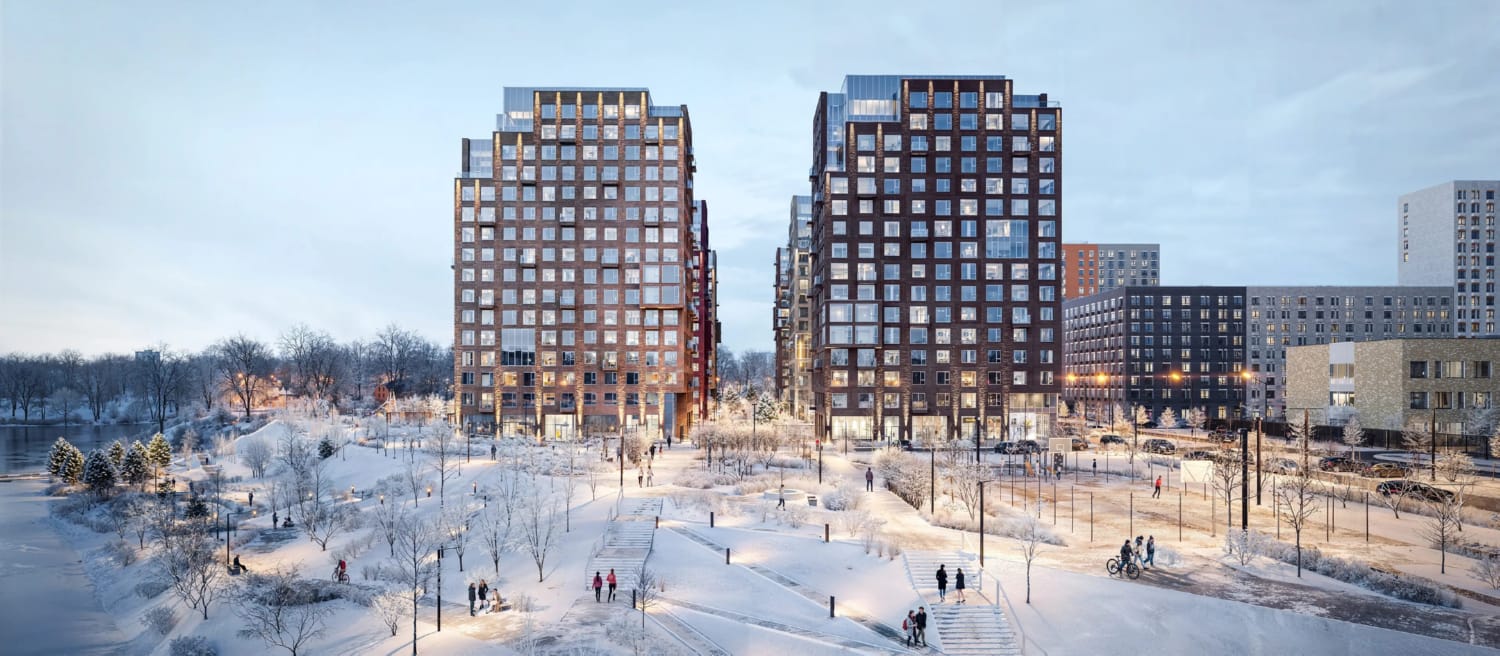 Фасады выполнены из фактурного кирпича, который напоминает текстуру природных материалов. Вставки из стекла создают эффект невесомости, а чёткие геометрические линии и строгие формы корпусов придают кварталу современный и стильный вид.
